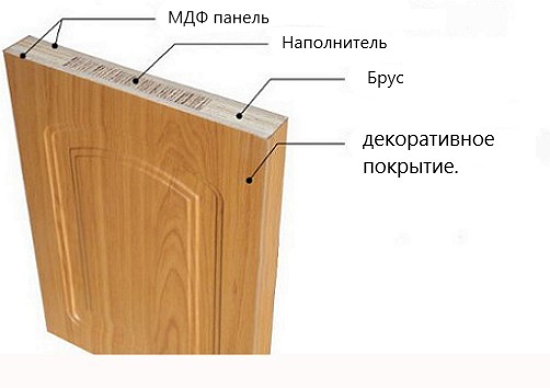 Основа двери – это рама, сделанная из массива сосны. Эту раму с двух сторон закрывают листом МДФ. Внутри образуется пустота, которая заполнена листами МДФ. Финишной отделкой может быть любое покрытие: шпон, экошпон, ПВХ и т.п.